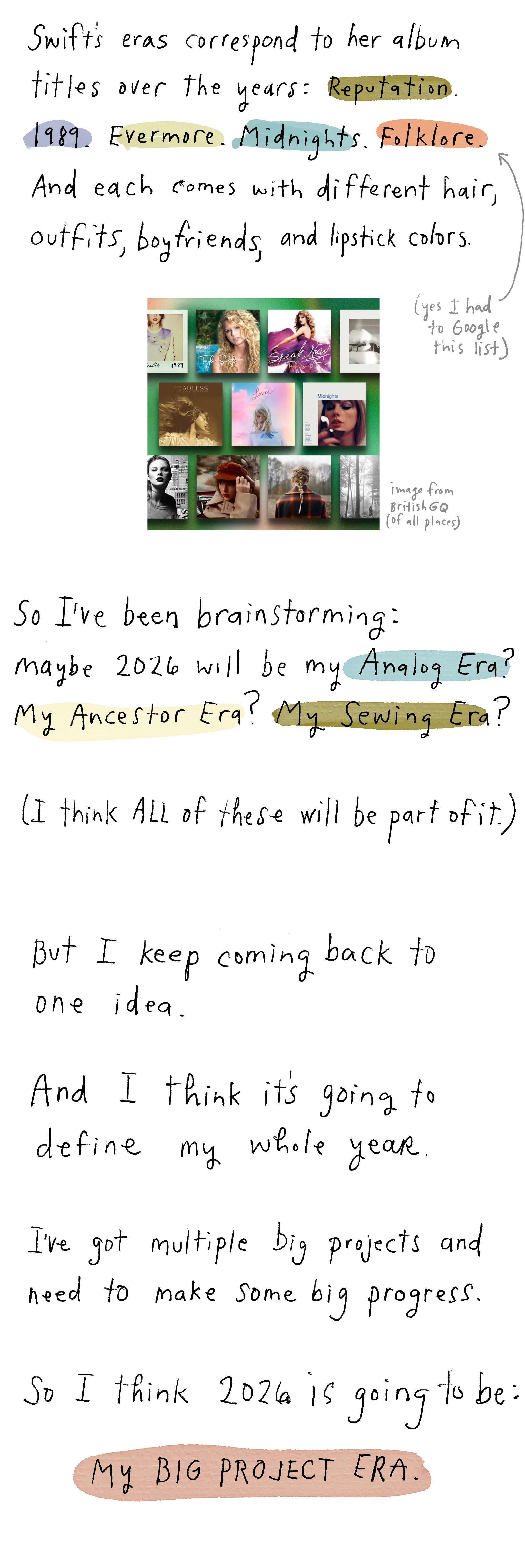 Is anyone else working on a Big Project this year? I’ll share my self-imposed syllabus and other parts of my journey here. But I’ve also been thinking that I might go deeper into breaking down a big project in my monthly zoom hangouts for paid subscribers? And maybe even offer a separate, exclusive year-long class/workshop with monthly meetings for a small group of folks who want to put time (and money) into working on big projects together? Would love your thoughts, and would love to hear what ERA you’re in!