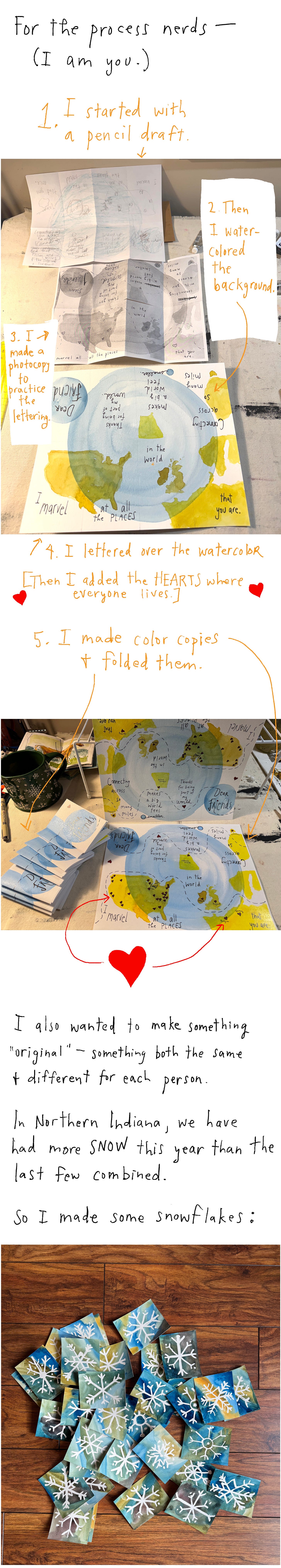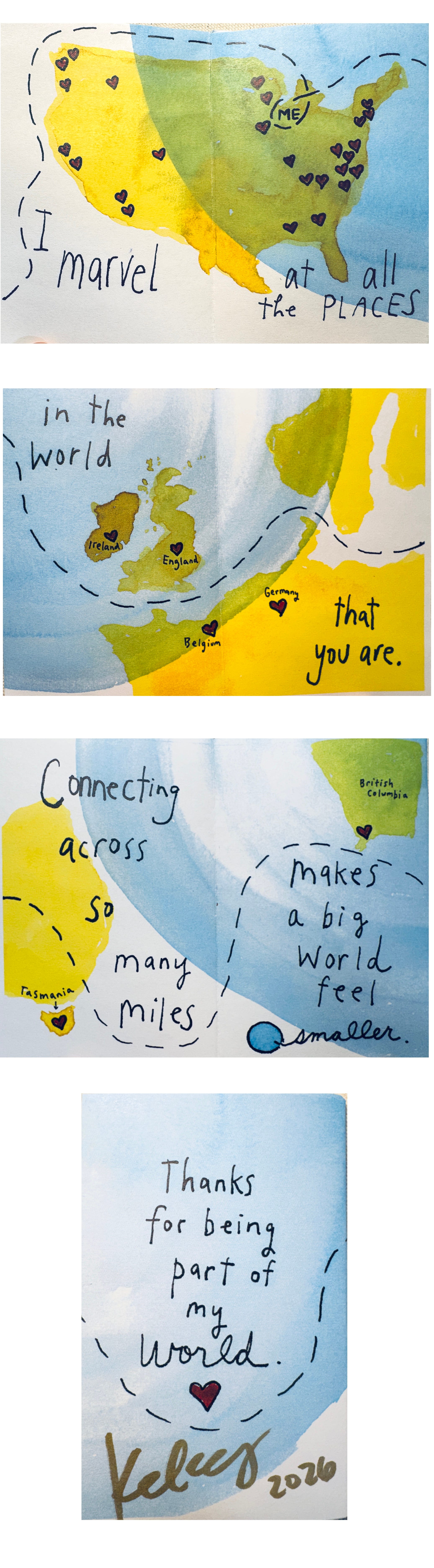 This is a mini-zine I sent to paid subscribers who signed up for New Year’s snail mail, but it applies to everyone I’ve connected with here. It truly is a marvel to interact with so many people across so many miles. Thanks to all of you for being here, for your comments and community, for your art and words. You help me sharpen my (metaphorical) ax! The worse things get out in the world, the more I appreciate all of you.