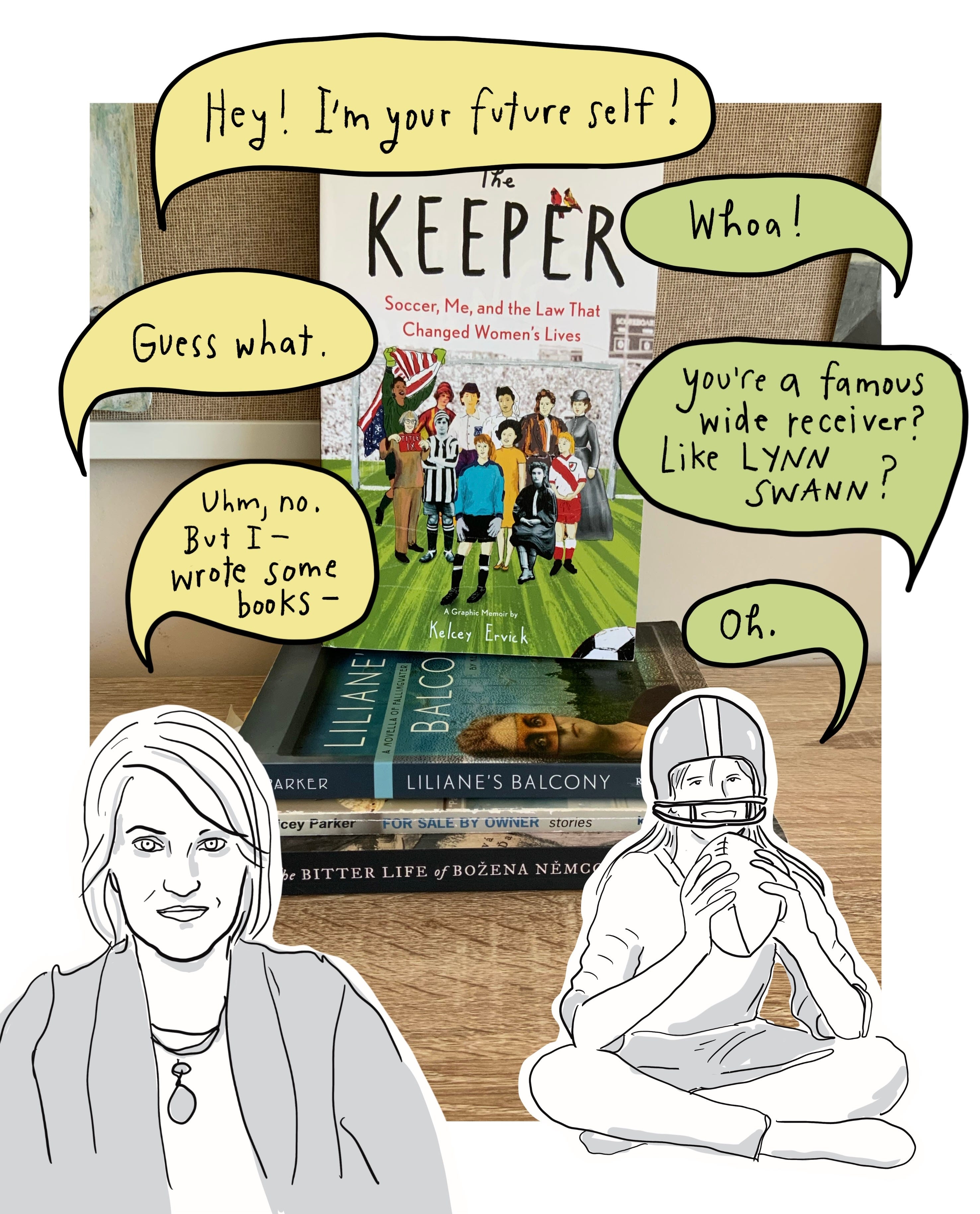 p.s. Here’s a comic I shared earlier this week on National Girls & Women in Sports Day. In which my grown-up self breaks it to my younger self that I didn’t get to become a wide receiver like Lynn Swann on the Pittsburgh Steelers, which I dreamed about—but that I did publish some books, including one about growing up playing competitive sports (thanks to Title IX!).