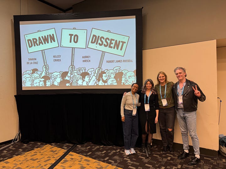 Top left: me with Henriette Lazaridis of Galiot Press Substack (holding Robyn Ryle’s book!) Top right: Our comics panel with Sharon Lee De La Cruz, Aubrey Hirsch, and Robert James Russell.